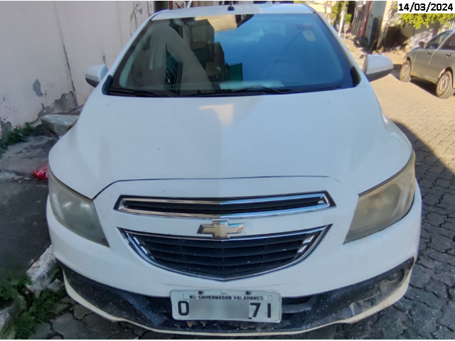 GM/PRISMA 1.0MT 37, placa O**-**71, ano/modelo 2013/2013, cor branca, a gasolina, cambio manual, com porta malas, lateral esquerda e direita todos amassados, com banco de couro rasgado, com para-choque mal encaixados, com farol quebrado, em péssimo estado de conservação. (Proc. 0004179-28.2014.4.01.3813)